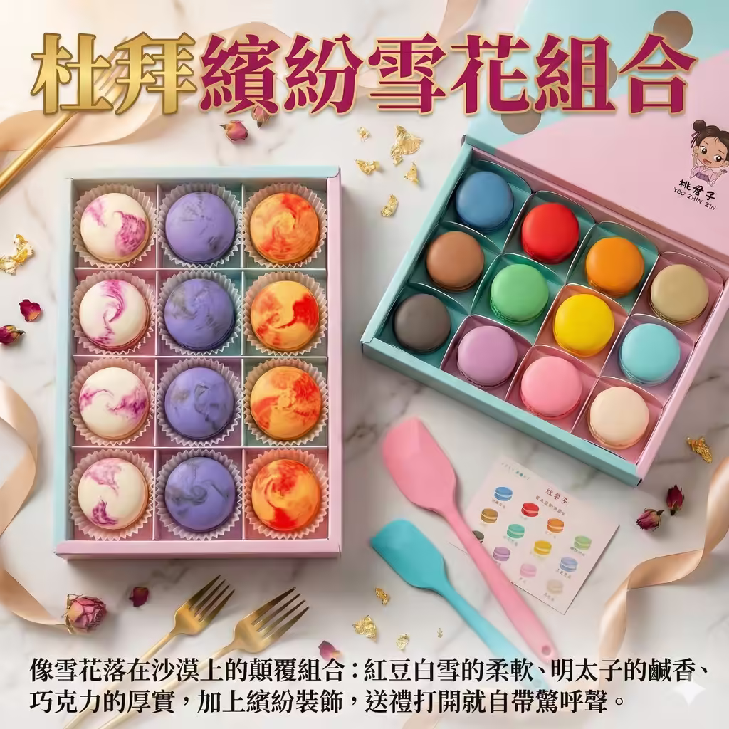 繽紛手工馬卡龍12入1盒(12種口味各1) 杜拜雪花馬卡龍12入1盒(杜拜巧克力*4,明太子*4,紅豆麻糬*4)